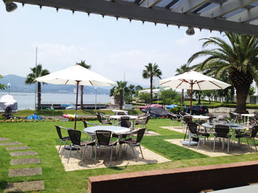 屋根つきのテラス席、白いパラソルのある芝生の席、