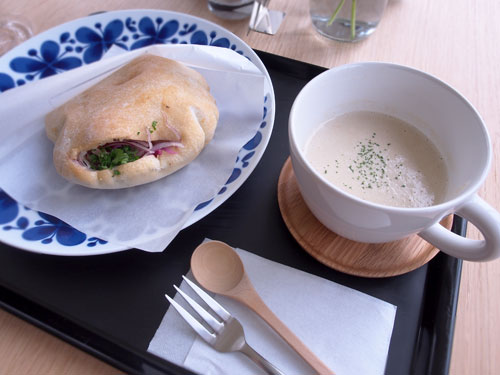 ピタサンドとごぼうのスープのセット。