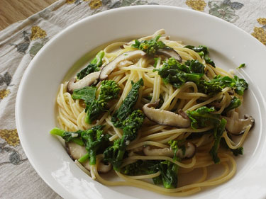 定番な感じですが・・・菜の花+アンチョビ+しいたけのペペロンチーノ。