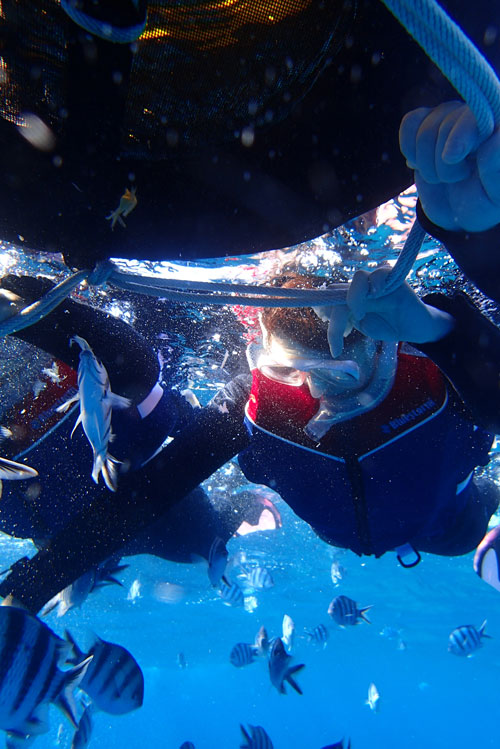 (私たちは浮き輪につかまっているだけですが 笑)おさかなの餌付体験。