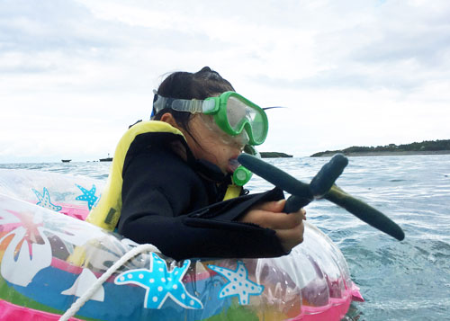 浮き輪をつけて休憩中のムスメに、Kさんが潜って何やら持ってきてくれました。