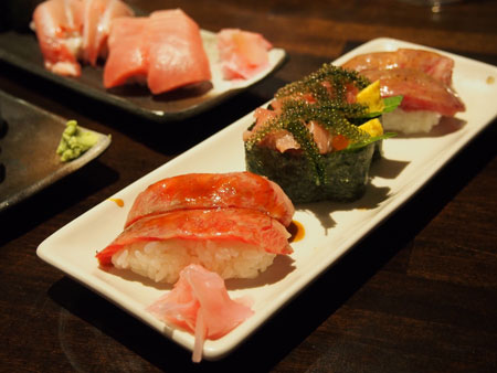 ・石垣牛の握り(塩・タレ) ・まぐろと海ぶどうの軍艦 のふたつ!!