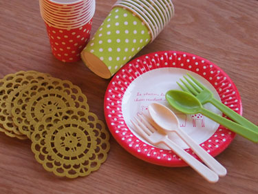 紙コップ、紙皿、プラのカトラリーにフェルトコースター。