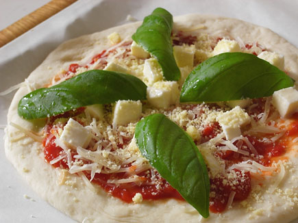 オリーブオイルをまわしかけ、バジルをのせて。