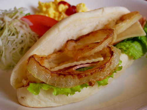 オニオンリングの香ばしい甘さがフワフワの白パンに引き立てられて・・・おいし~っ!^^