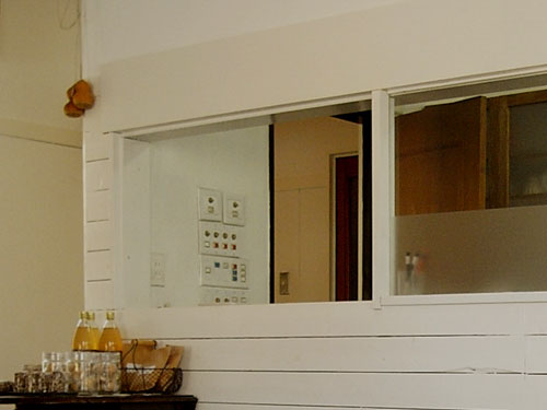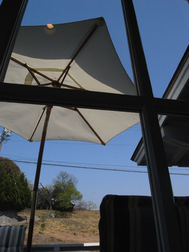 窓越しに白いパラソルが見えて青空とのコントラストがキレイなこと!!