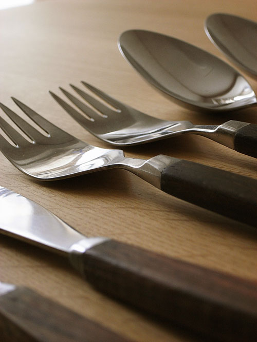 悩むところです。同じ北欧モノということで、ウッディなアンティークカトラリーと合わせて、