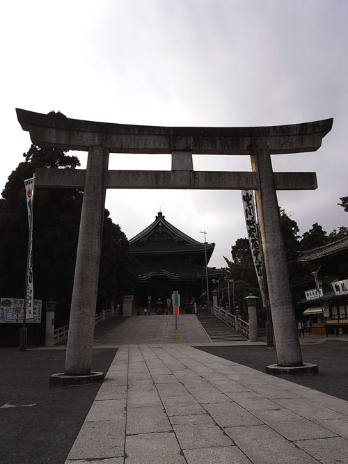 薄曇の天気の中、しっとりとした参道をゆっくり歩いていくと、目の前に現れた大きな鳥居。