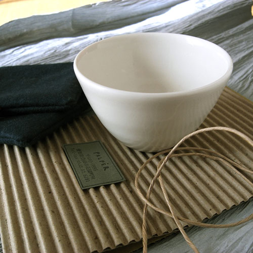 「PALPER」のシールが貼られ、かわいくラッピングされた器とコースター。
