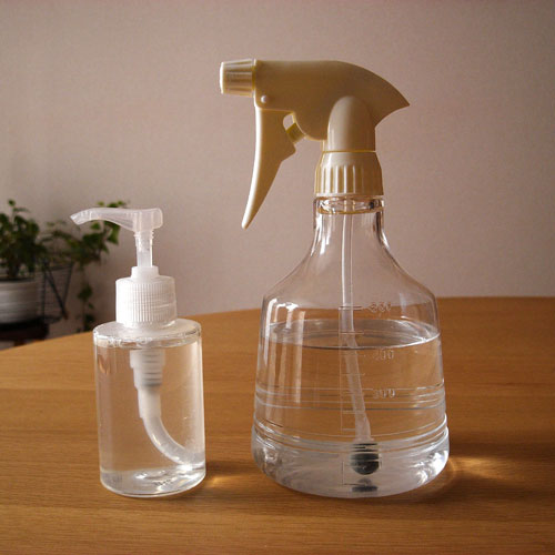①液体石鹸(左)と「アルカリウオッシュ」を溶かしたスプレーボトル(右)。