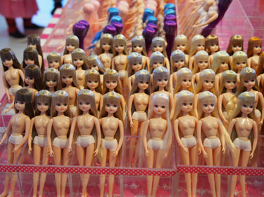 ここでは、髪の色、瞳の色、化粧の色が異なるリカちゃんのボディーが並び、