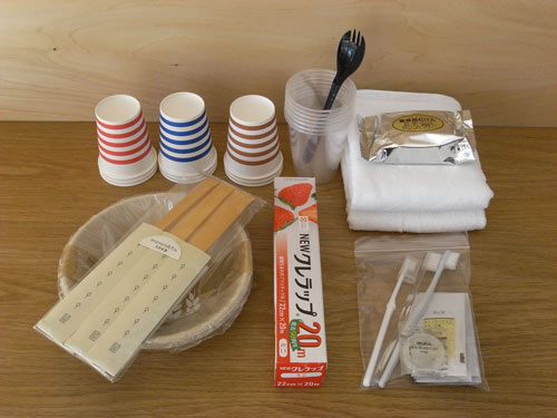 紙コップ、プラカップ、紙皿、先割れスプーン、割り箸、ラップ、タオル、石けん、