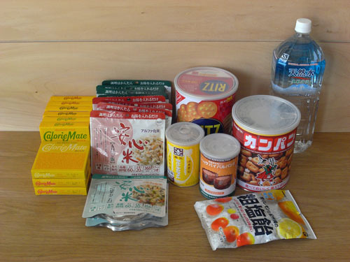 飲料水(3ケースほど)、カロリーメイト、アルファ化米、リッツ、カンパン、