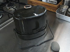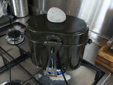 沸騰するまでは弱火。ぶくぶく吹きこぼれてきたら石でおもしをして中火~強火。