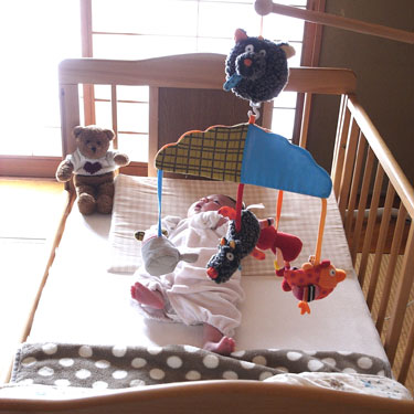 ↑↑↑ 豊橋の職場の方たちから頂いたオルゴールメリーの下で手足をパタパタしているナズナ。