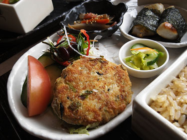 豆おこわ、豆腐ハンバーグ、温野菜に生野菜、きんぴら、具だくさん味噌汁にお餅まで(笑)