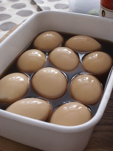 半熟味玉は朝準備して出かけるまで漬けダレに浸しておけばいいし、