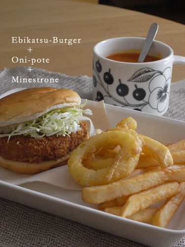 写真を見てのとおり、オニポテだけではなく海老カツバーガー+ミネストローネもセットに。
