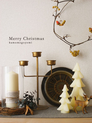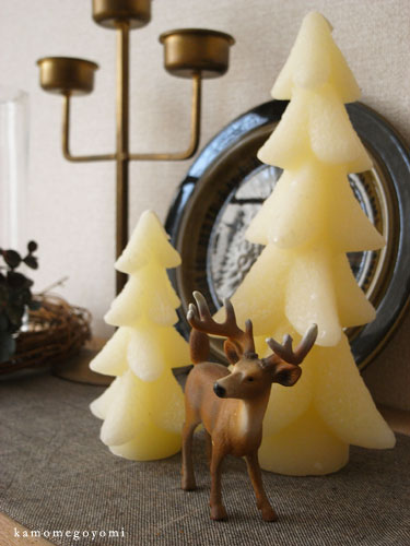 ARABIAのプレートの前には、ミルク色のもみの木キャンドルと、ヘラジカを。