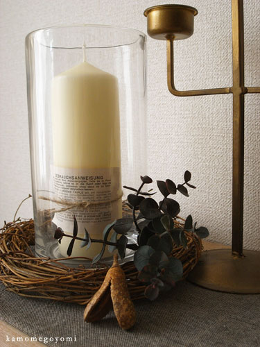 キャンドルに横文字の入った紙を巻いて麻紐でしばり、ガラスベースに入れてみました。