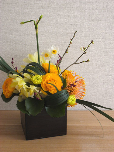 今回花器は家にあった四角い木製のものを持込し、これに合うように・・・と。