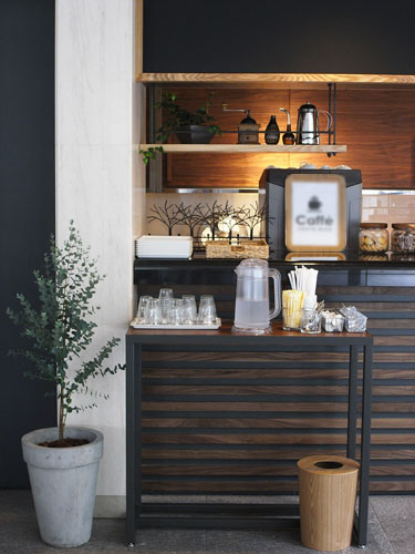 セルフ式のこのカフェ。もともとあった対面カウンターは黒基調の強めな色合いだったので