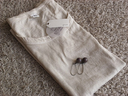 アイボリー色のタンクトップとくすんだピンク?のような紫?のようなの石のピアス。