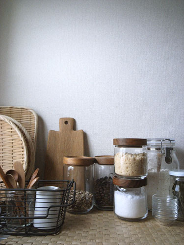 キッチンに並ぶガラスジャーを拭いたり、食器棚の中をキレイにしたり。