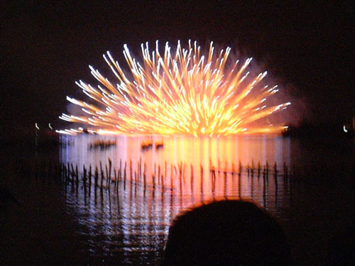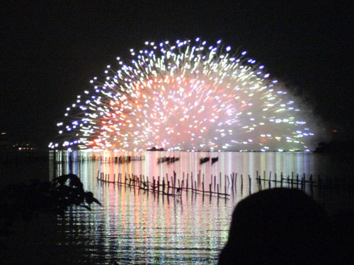 クライマックスを飾るのは湖面から半円に広がる花火。
